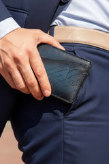 This fiery wallet features a rich, deep electric blue hue that gracefully darkens at the edges, adding. It is made from high-quality leather and it offers ample space for your essentials with timeless charm.