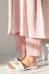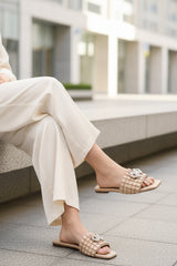 These beige flats are designed with interwoven faux leather and embellished stone buckle details.