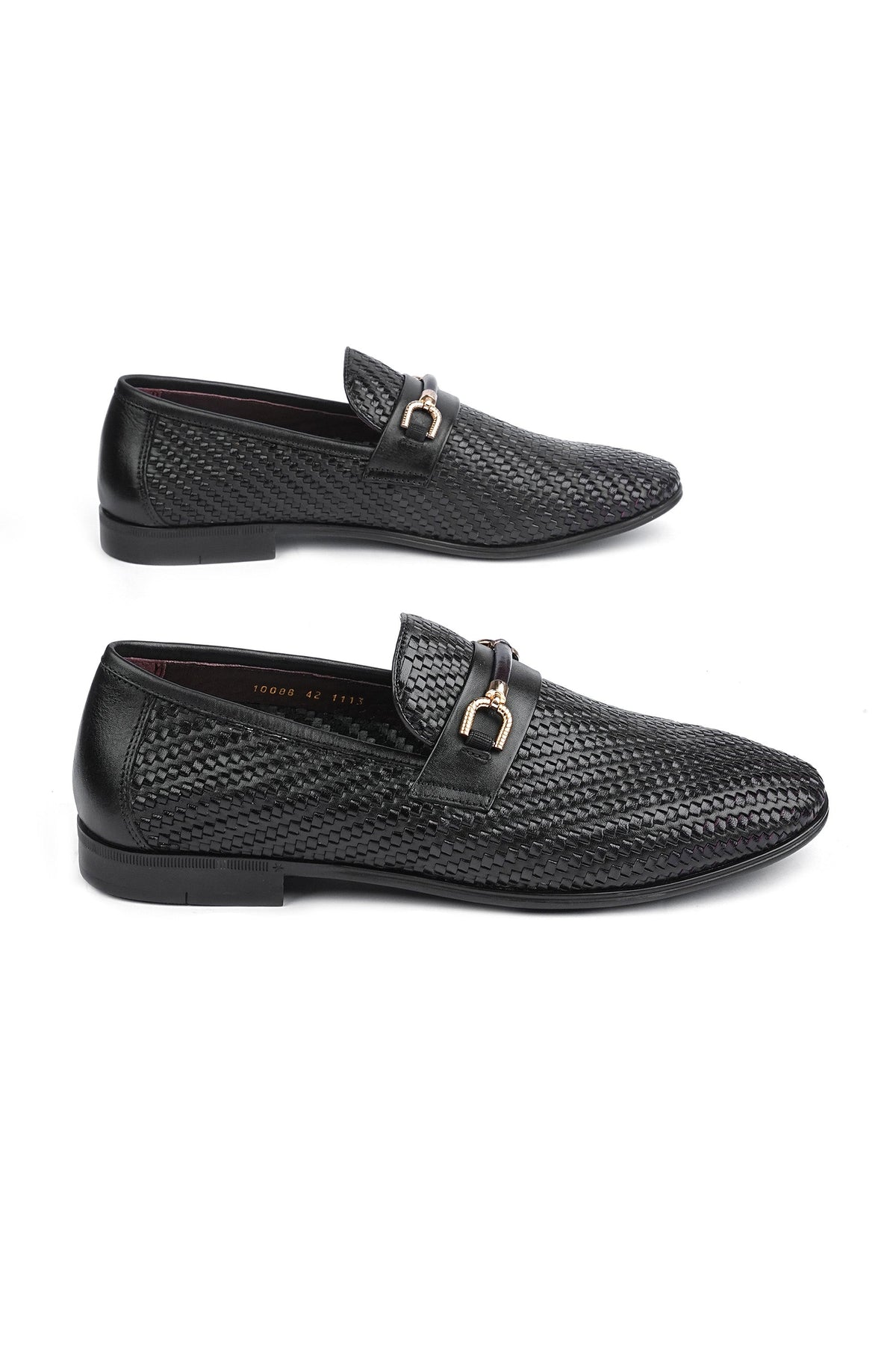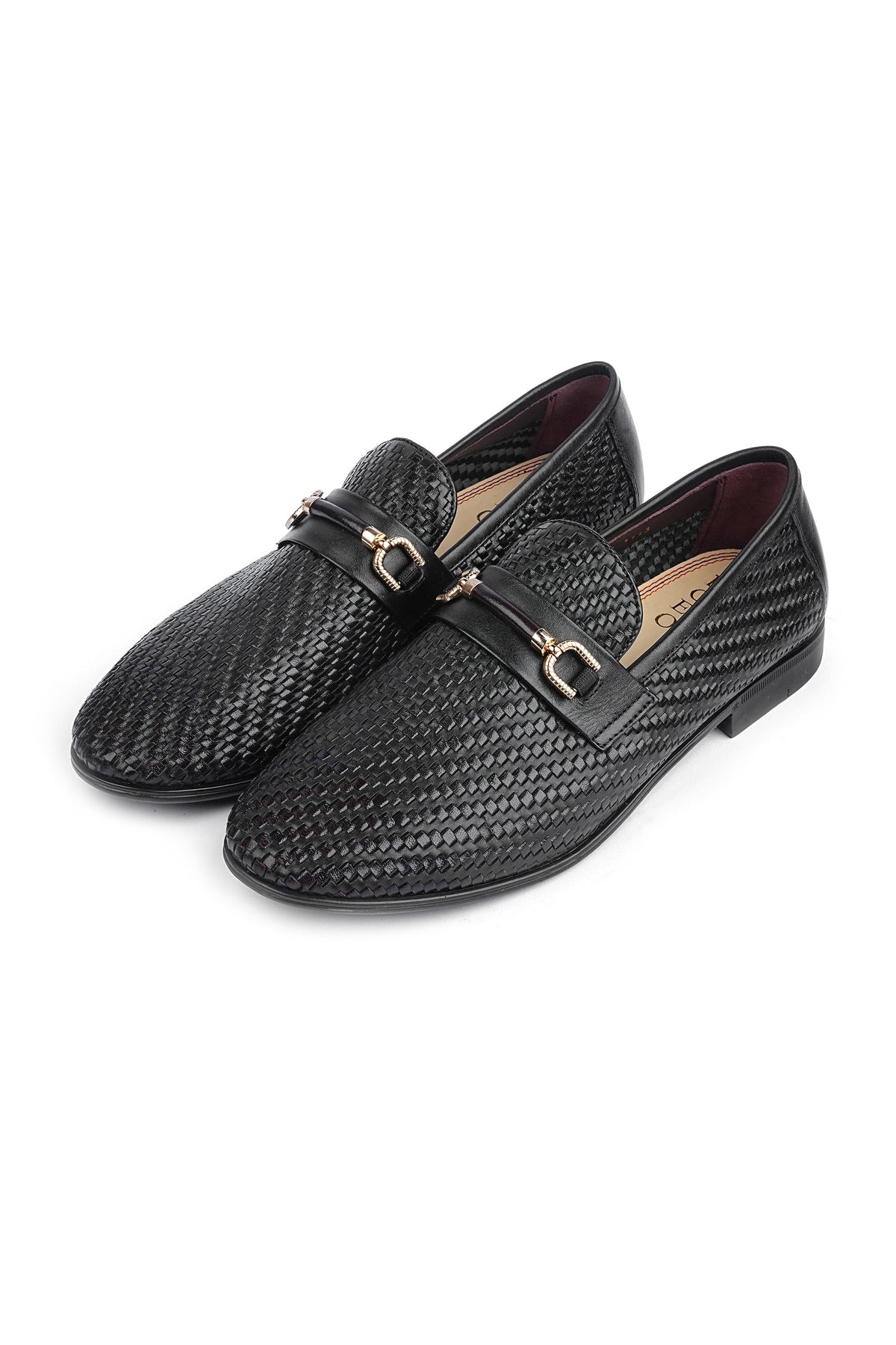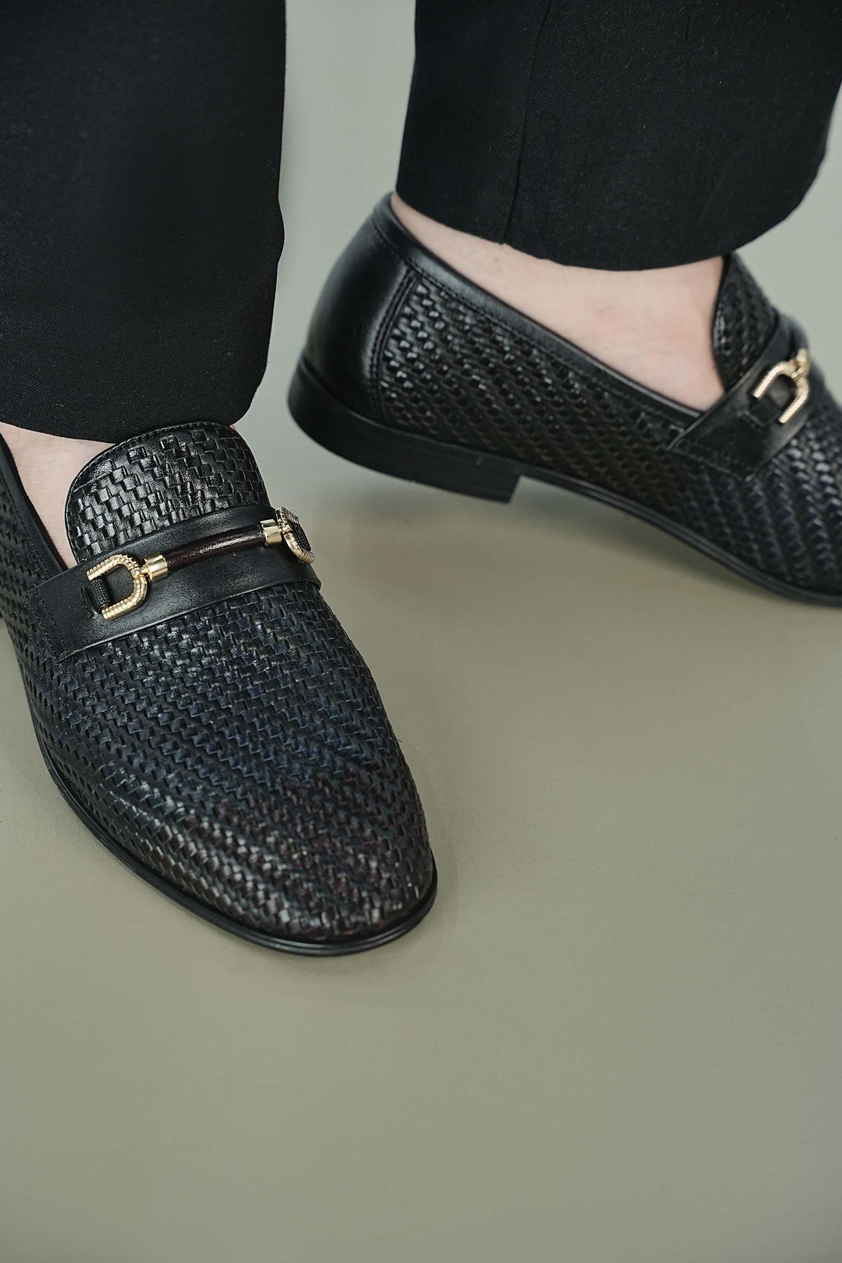 This black formal footwear has an intricate designed with woven texture and metallic hardware.
