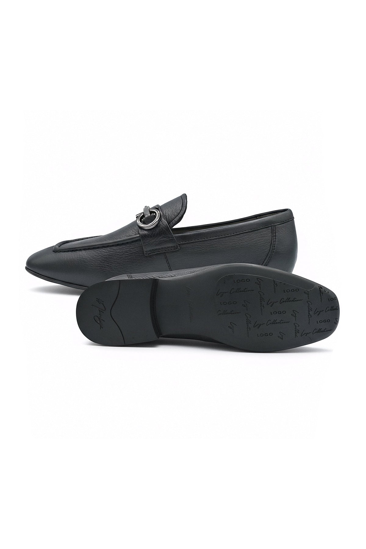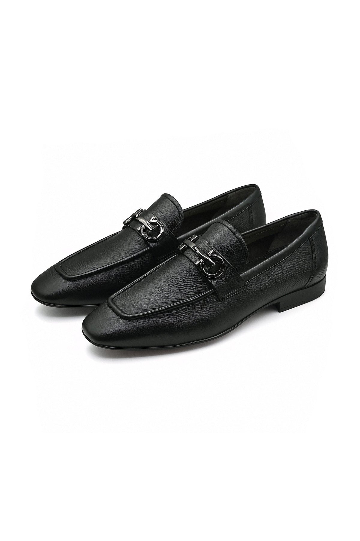 Black loafers featuring a strong textured finish, defined by a metallic buckle