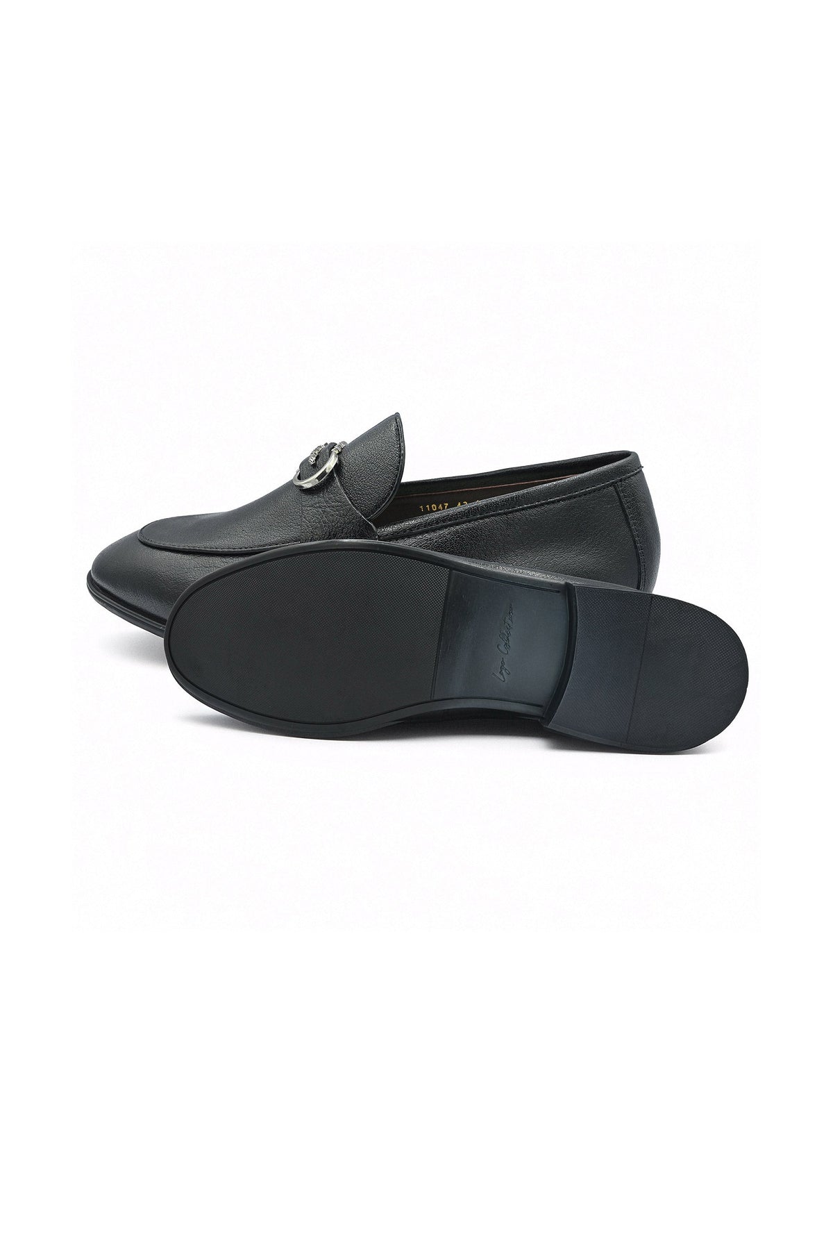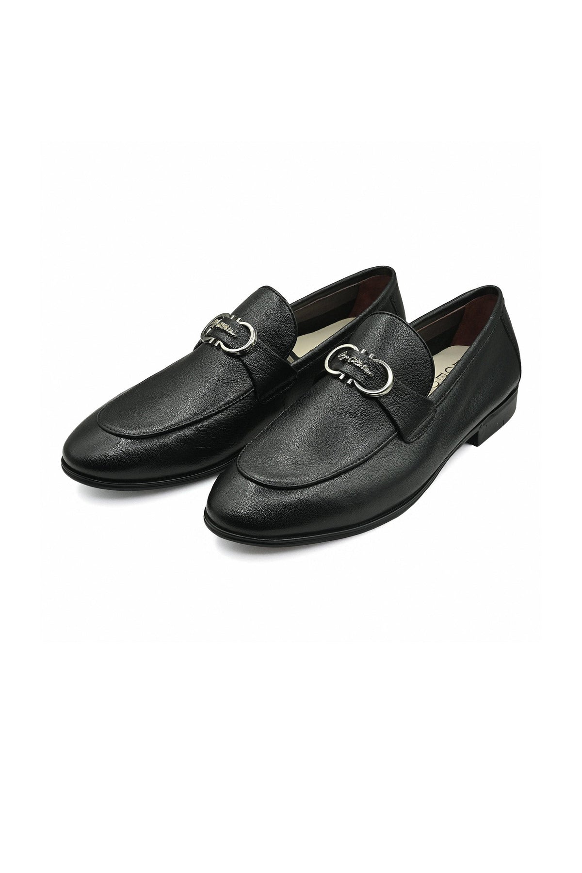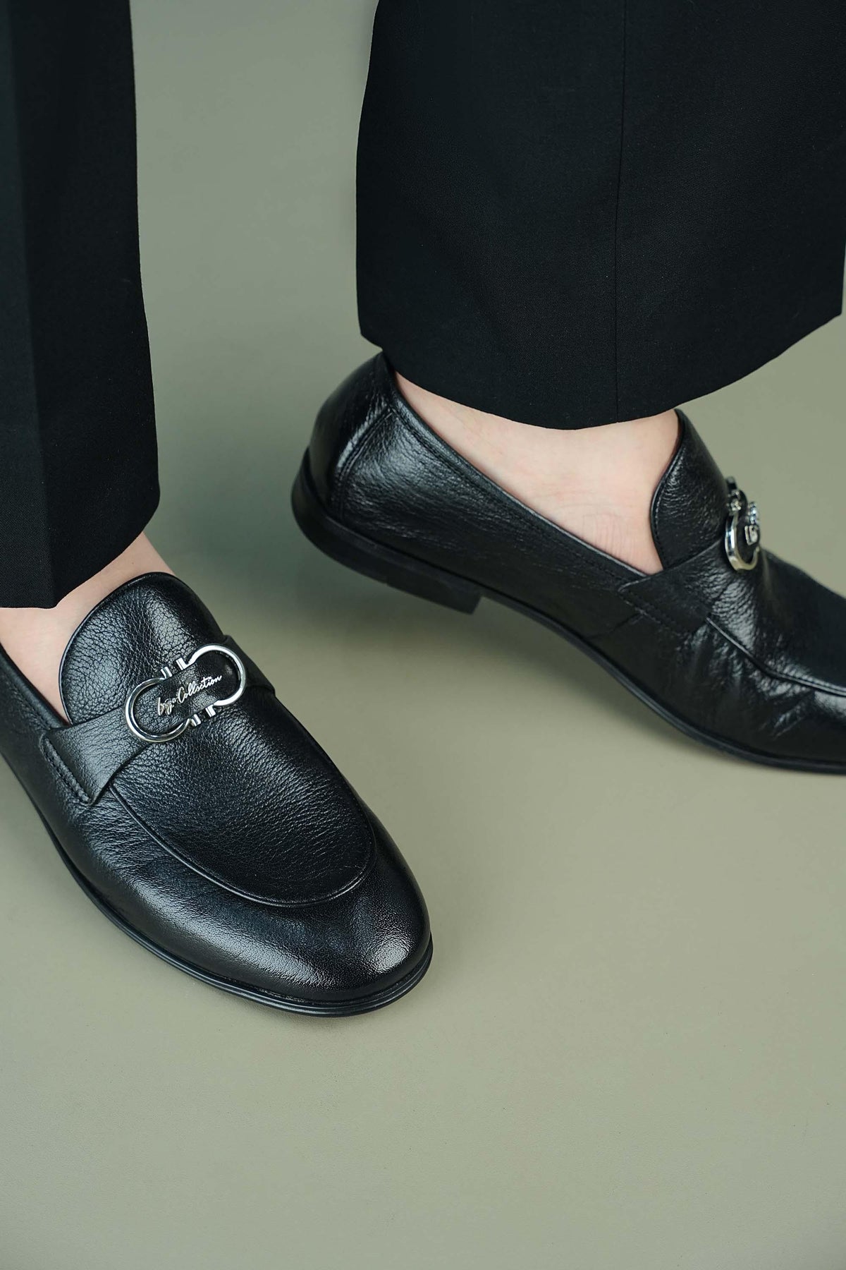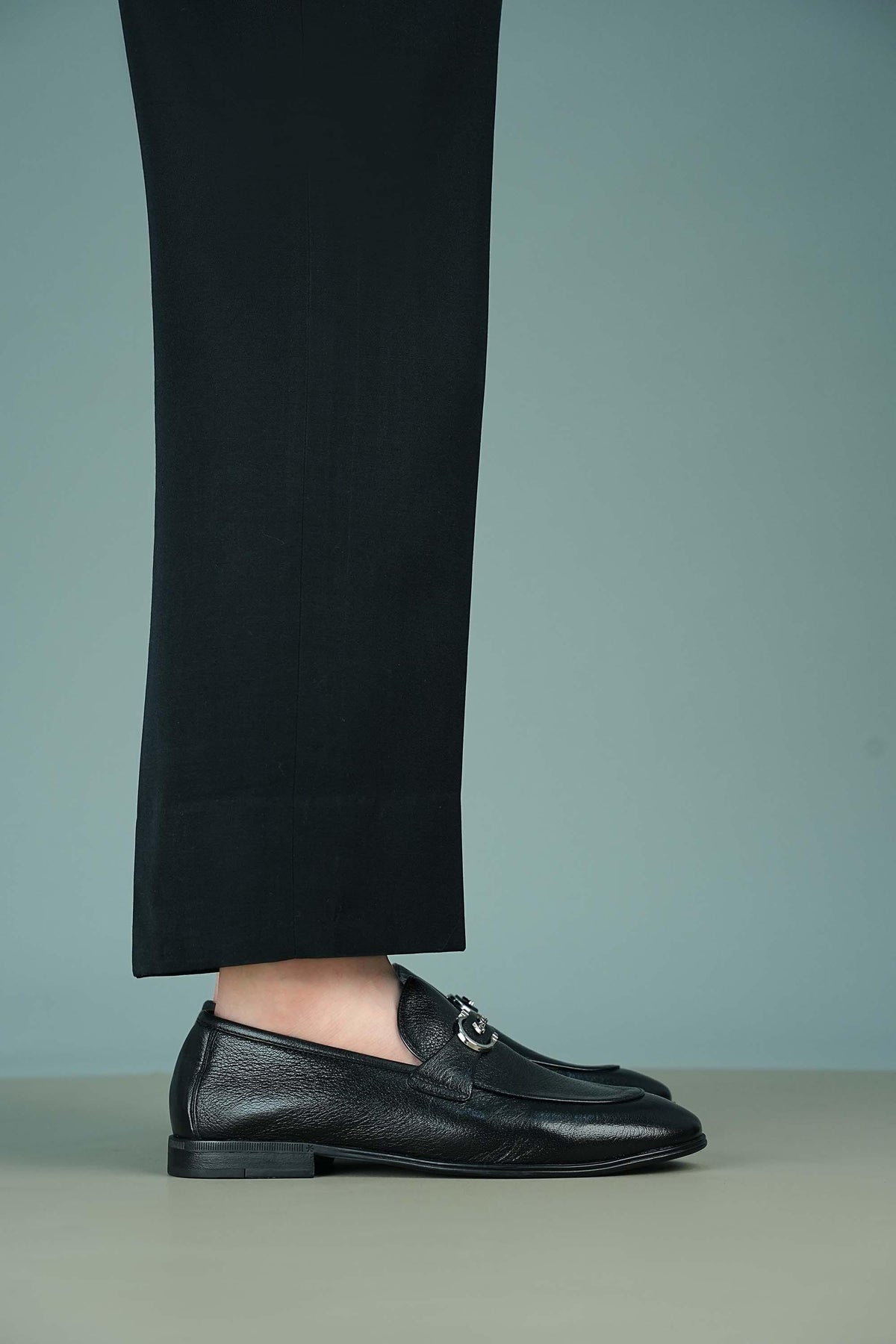 Classic black loafers with a defined silhouette, elevated by a decorative buckle