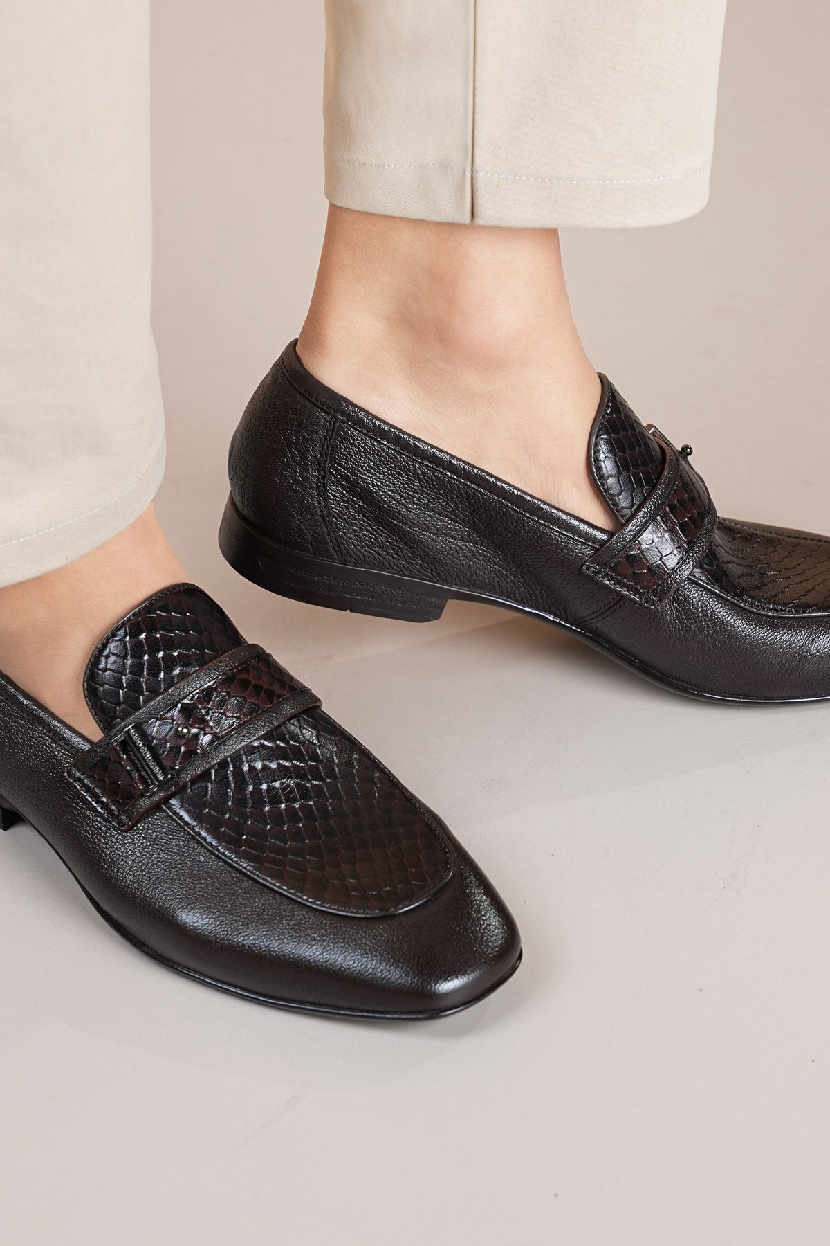 Stand out with these chocolate brown formal shoes featuring a crocodile texture plug and milled finish. They are designed for men who appreciate distinct style and timeless elegance.