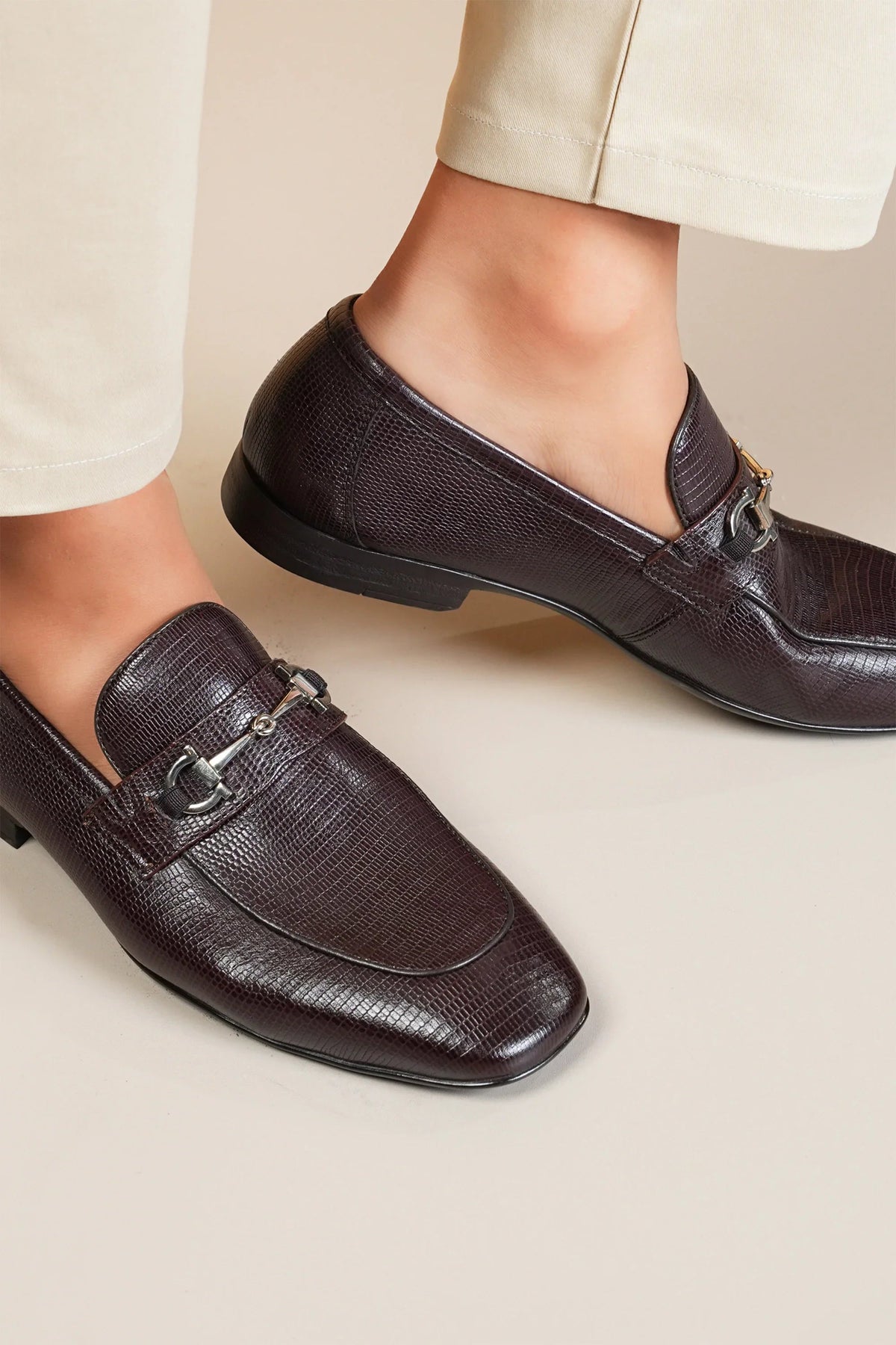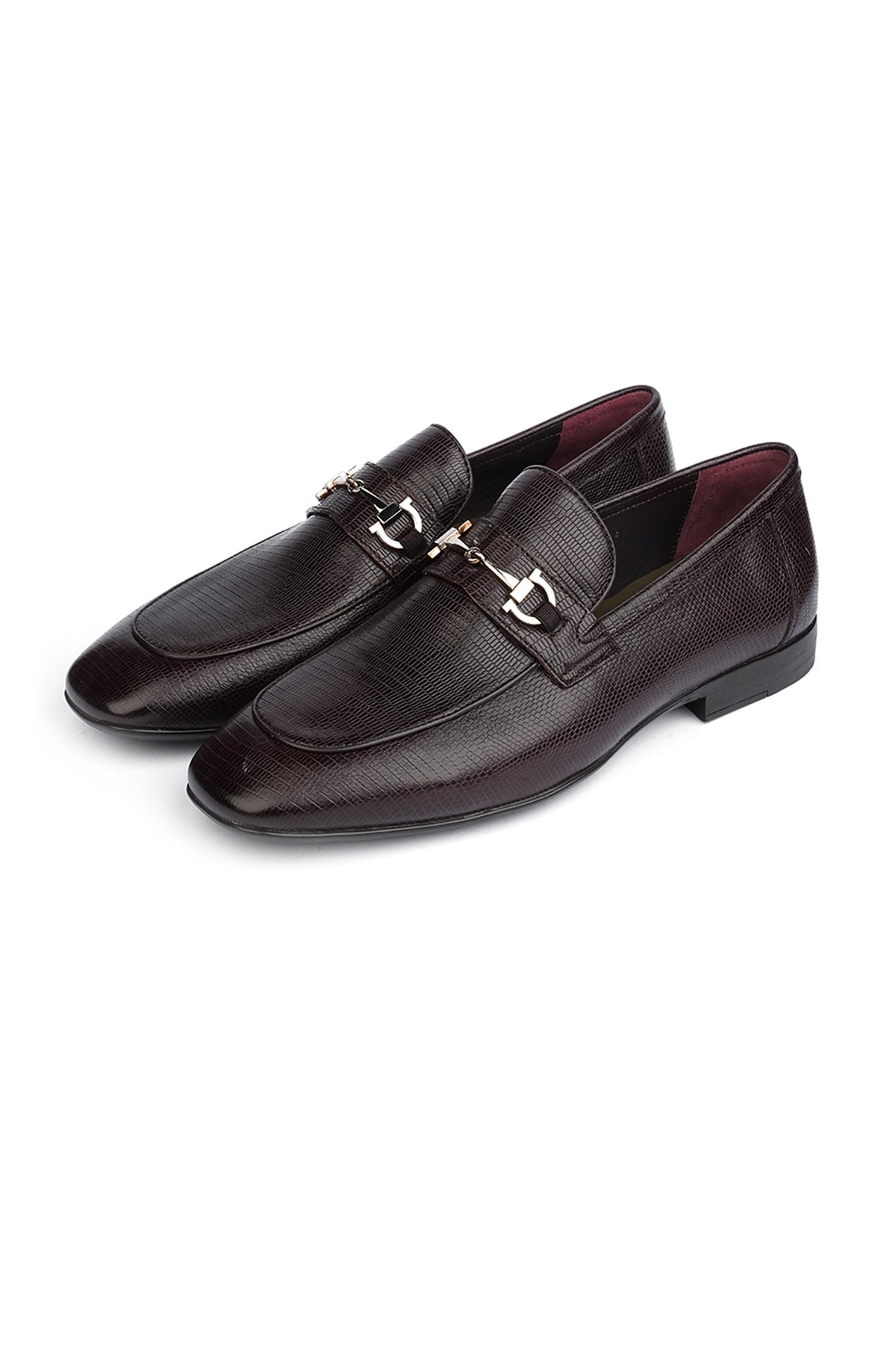 Add an elegant touch with this dark maroon formal footwear that features lizard-textured leather and a modern buckle accent.
