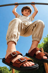 Style up in Logo kids slippers this summer. These burgundy maroon suede slippers are designed for comfort and durability, these double strap slippers feature two adjustable buckles for a secure and customizable fit.