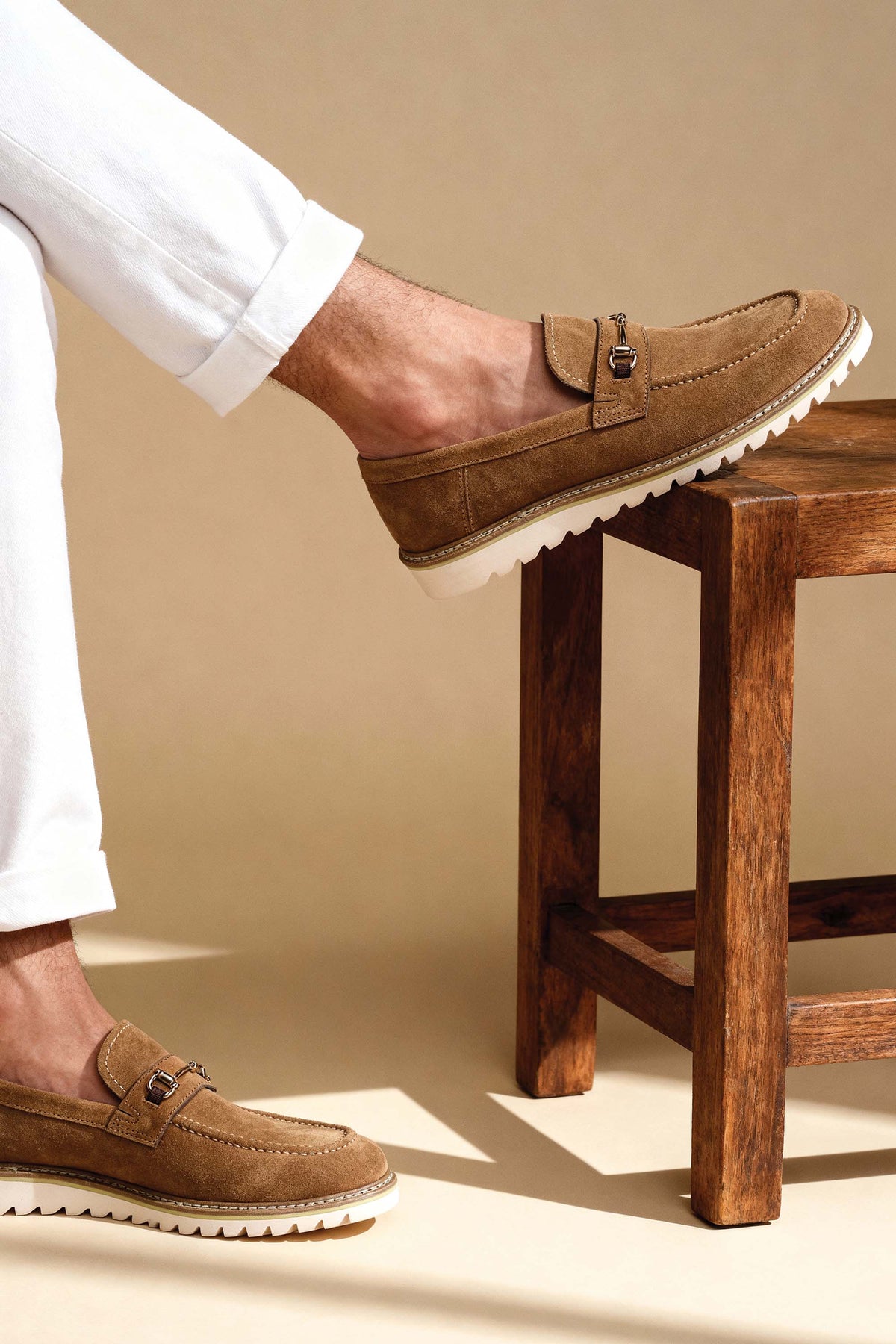 Camel brown loafers with a smooth suede upper and a decorative golden buckle for a refined touch.