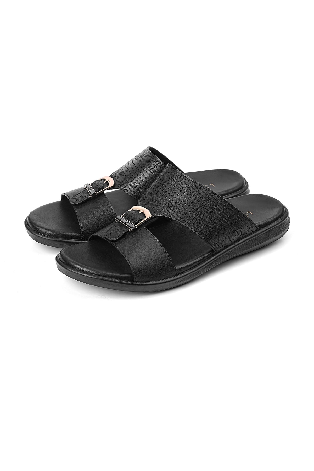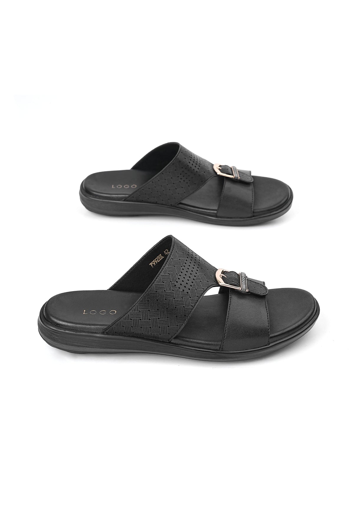 Black cow leather slippers designed with a strong silhouette and a comfortable build.