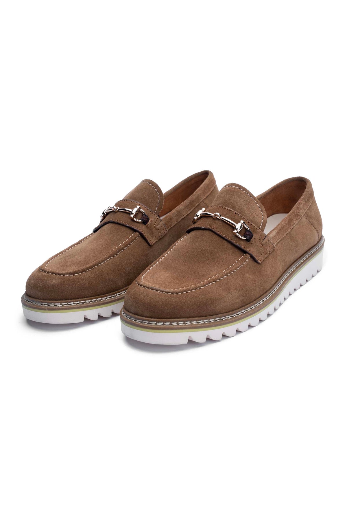 Camel brown loafers with a smooth suede upper and a decorative golden buckle for a refined touch.